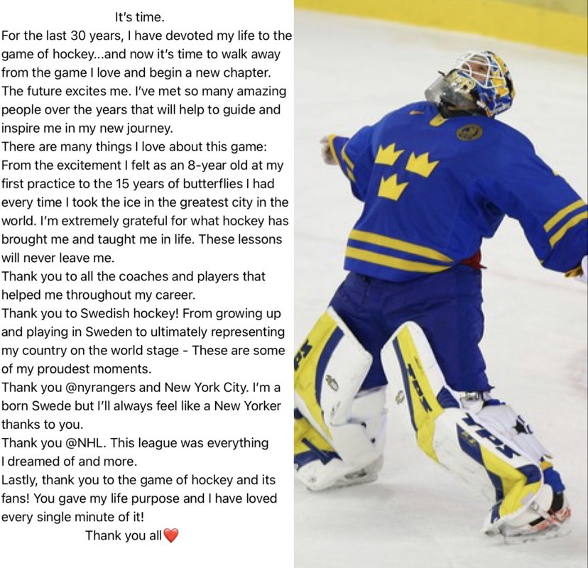 Rangers Legend Henrik Lundqvist Announces Retirement No 30 To Be Retired At Msg Next Season from s.yimg.com He previously played 15 seasons with the new york rangers. Le gardien, détenteur du sixième rang de l'histoire pour les victoires, a dû cesser de jouer en raison d'un problème cardiaque. Henrik lundqvist's tenure as the rangers' primary goaltender has come to an end, it's done so without reaching his ultimate goal. Complete player biography and stats. Henrik lundqvist (born march 2, 1982) is an athlete from sweden who competes in ice hockey. Публикация от henrik lundqvist (@hlundqvist35). Find henrik lundqvist stats, teams, height, weight, position: Born 2 march 1982) is a swedish professional ice hockey goaltender who is an unrestricted free agent.